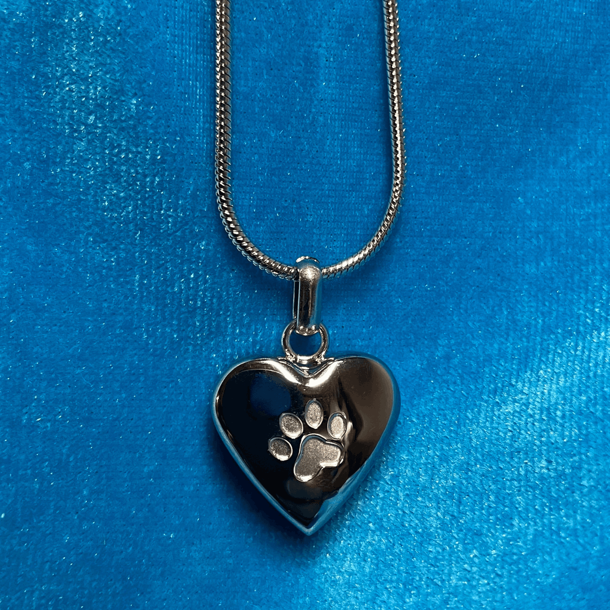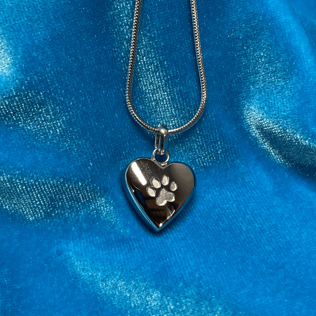 A lovely stainless steel silver tone heart urn pendant with a paw print etched on the front.